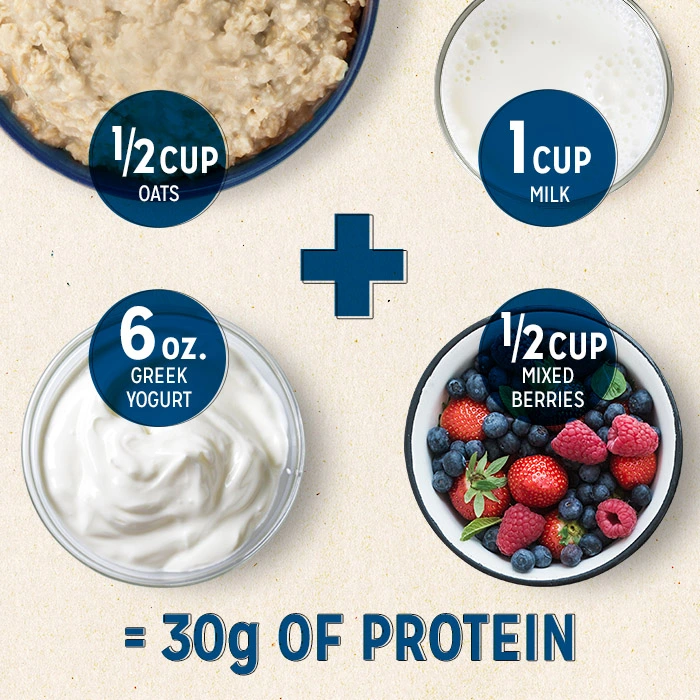 1. Oatmeal made with 1 cup (8 ounces) of milk plus Greek yogurt (6 ounces) with berries. Protein count: 30 grams.