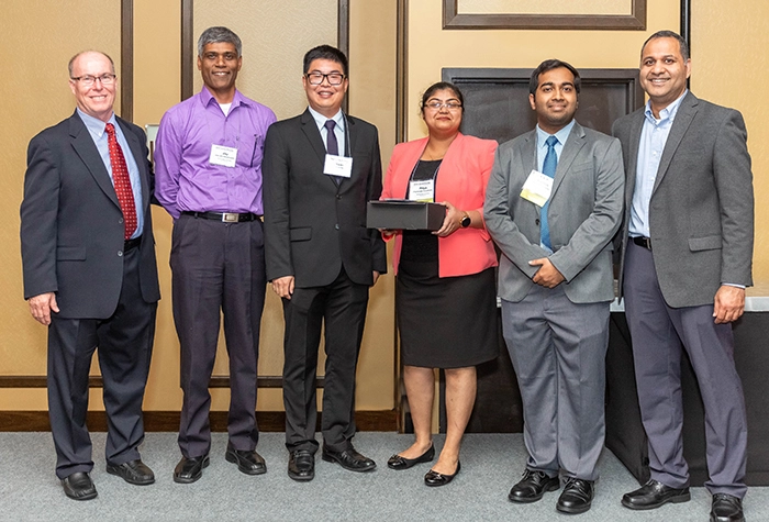 From left to right: Bill Graves of National Dairy Council (NDC), Kansas State Faculty Coach Jayendra Amamcharla, Team Captain Yuda Ou, Priyamvada Thorakkattu, Karthik Sajith Babu, and Rohit Kapoor of NDC