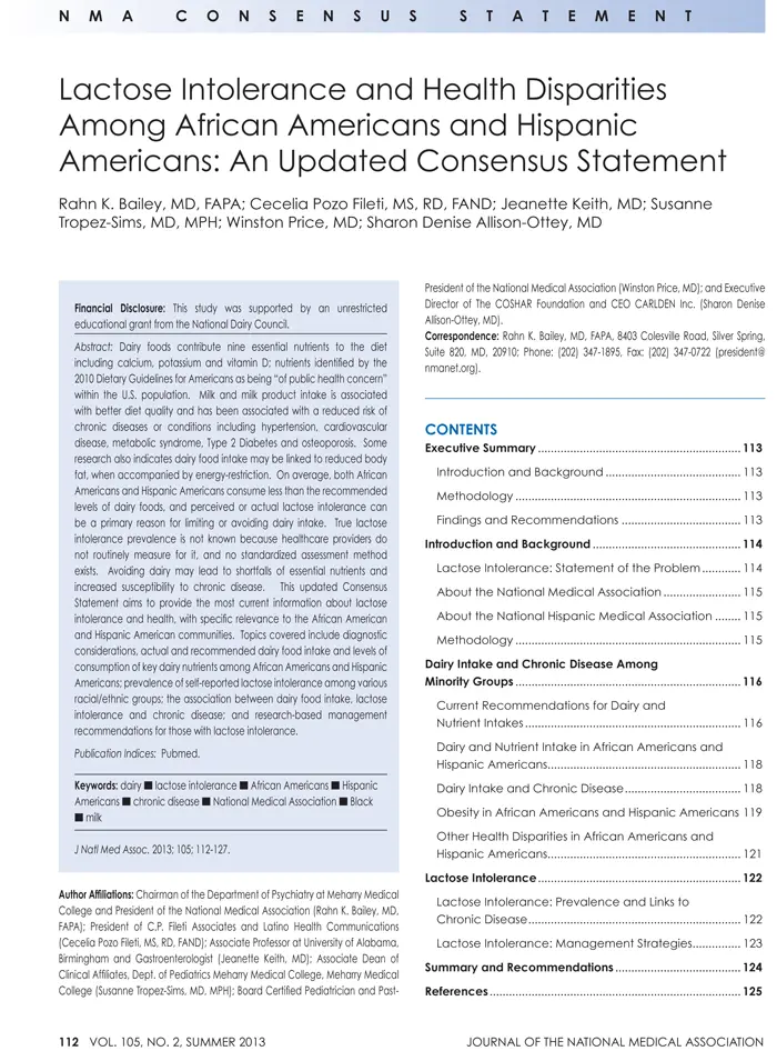 National Medical Association's updated consensus statement on lactose intolerance and health disparities among African Americans and Hispanic Americans.