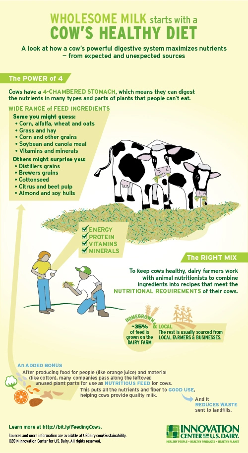 Before milk reaches your grocery store, farmers work closely with animal nutritionists and veterinarians to come up with the right mix of feed ingredients to meet their cow’s nutritional needs. From there, a cow’s powerful digestive system maximizes the nutrients found in expected – and unexpected – sources. Learn more: