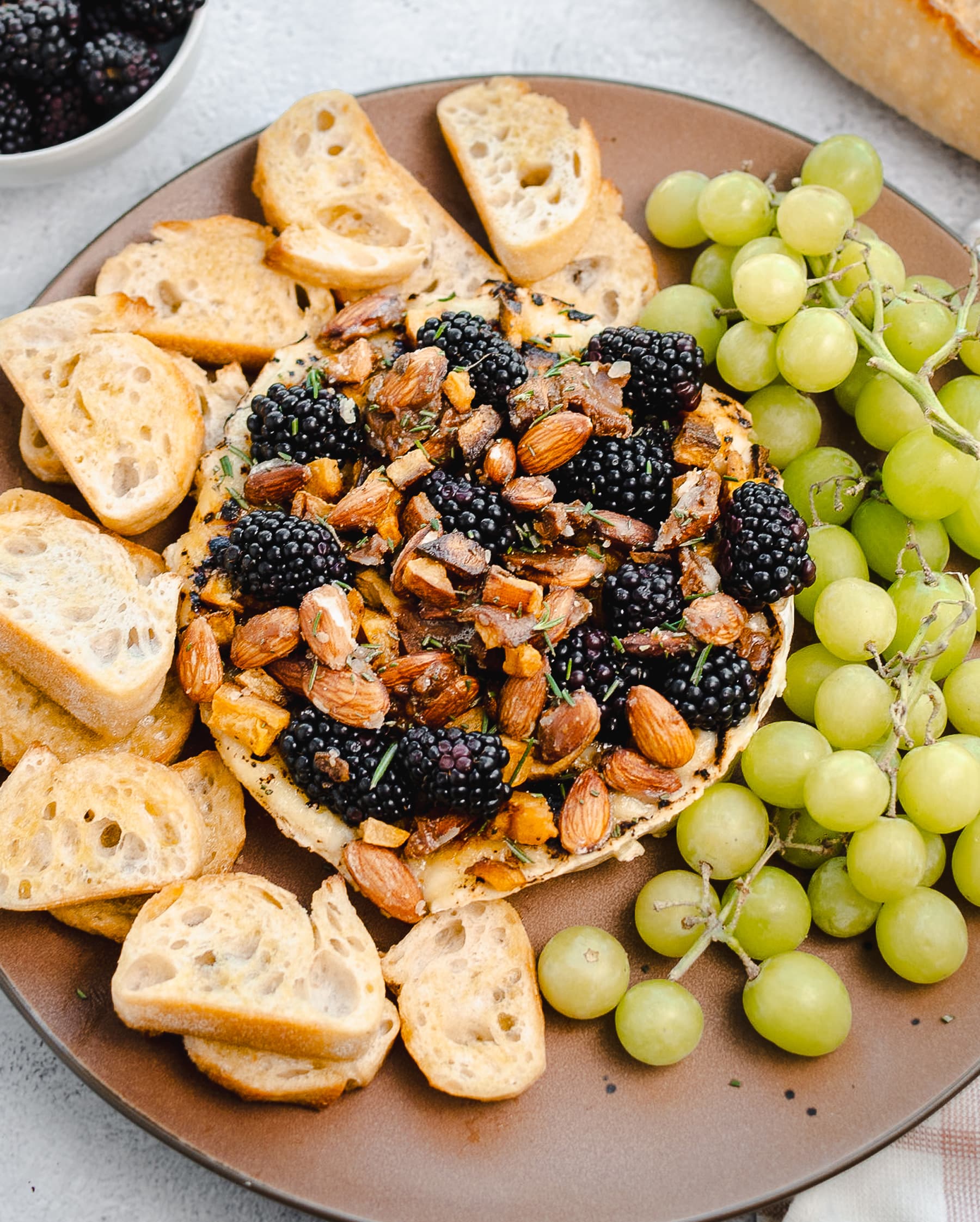 5. Top the brûléed Brie with fresh blackberries, the cooked butternut squash, and the toffee almonds. Garnish with chopped rosemary and serve immediately with crusty bread.
