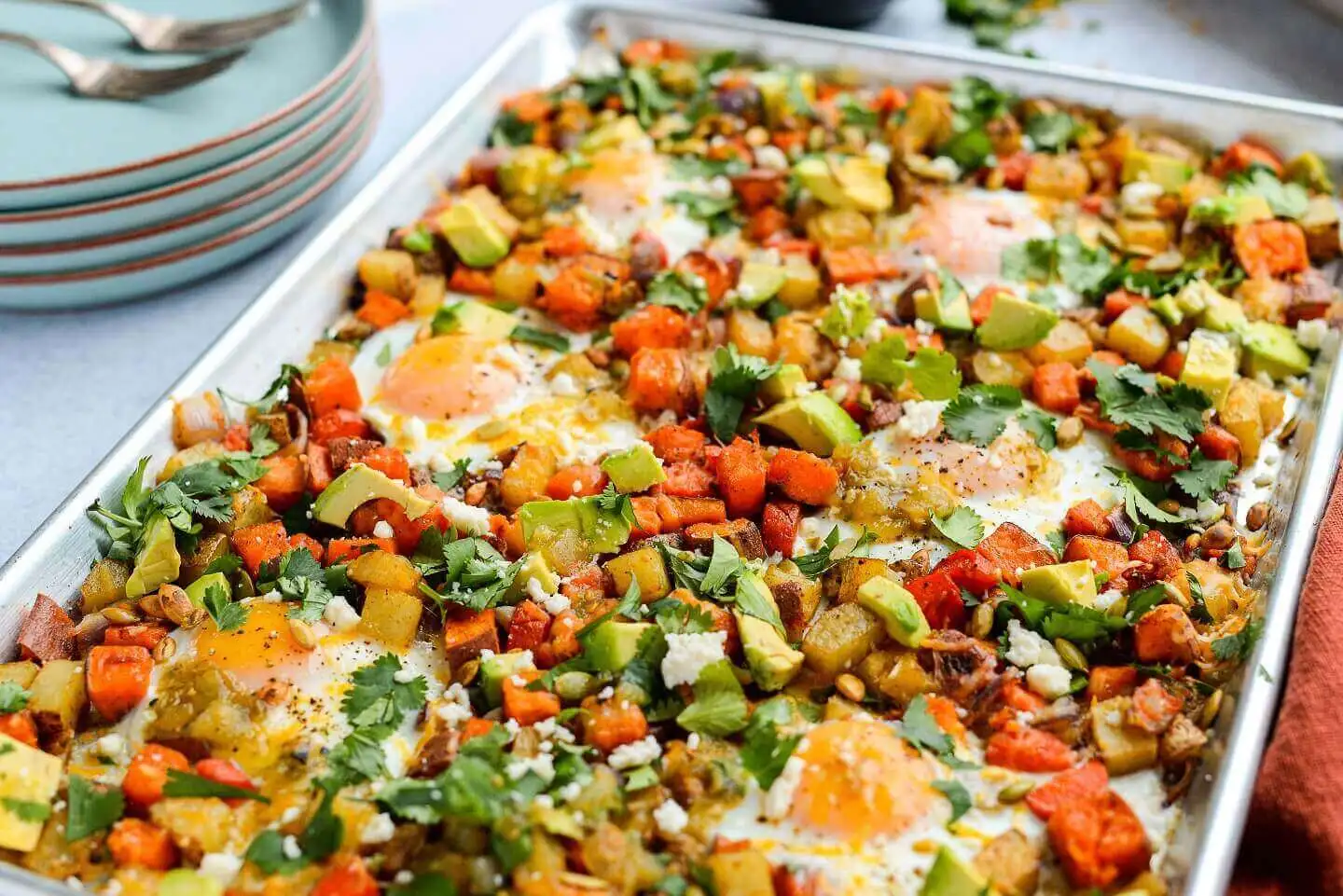 Start your day in a colorful way by making this all-inclusive roast. With sunny side up eggs and chopped plants galore, it’s like a sheet of six suns peeking through a haze of rainbow goodness. The queso fresco topping adds a cloud of savory flavor. Create your own variations too—the sky’s the limit.