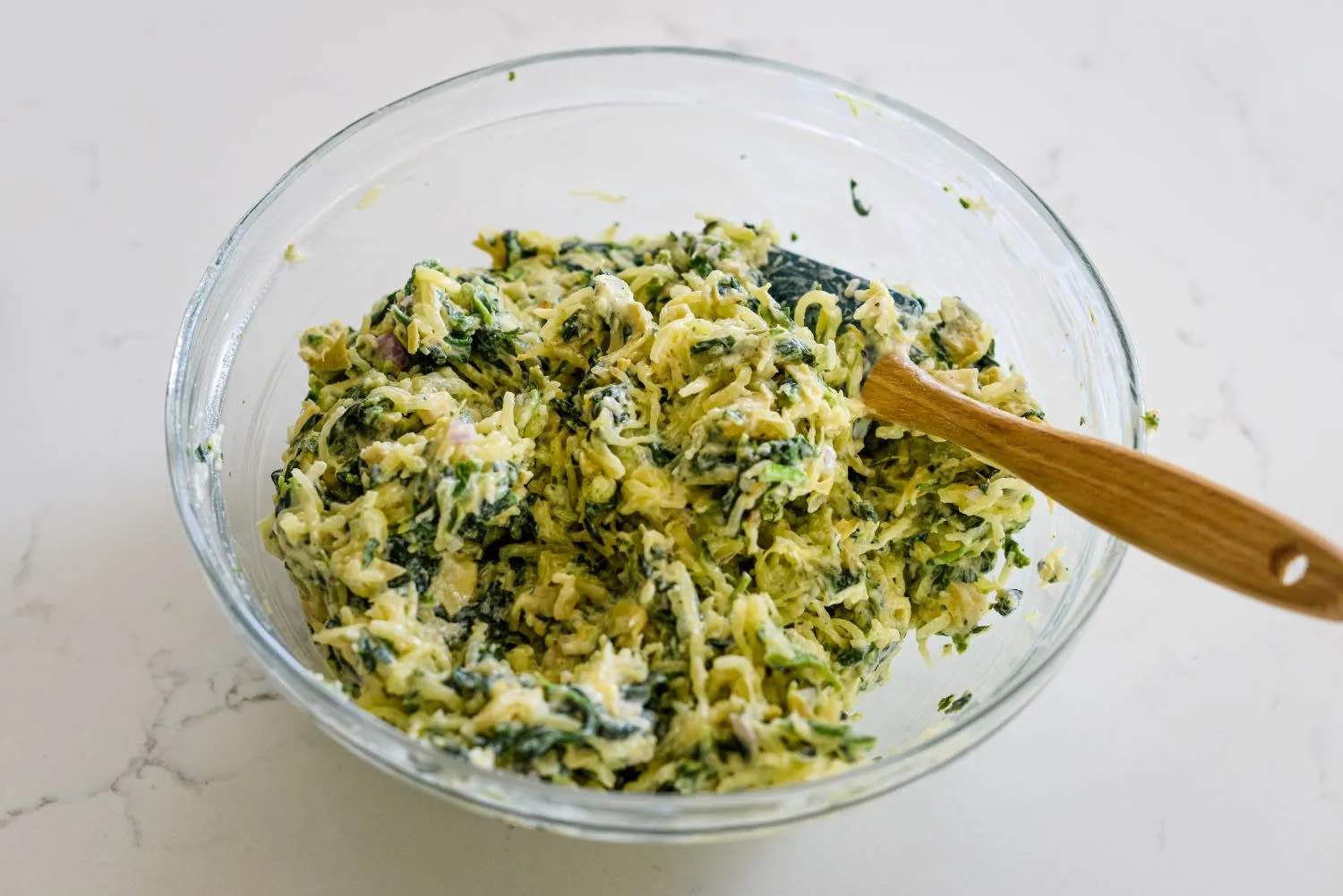 - Add artichoke hearts, spinach, shallot, garlic, cream cheese, yogurt, Parmesan cheese, salt and pepper to squash strands.