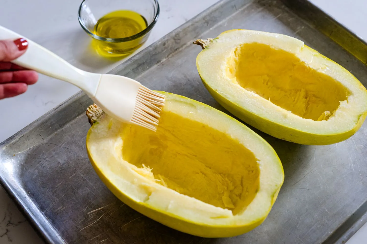 - Heat oven to 375 degrees. Brush the inside of the spaghetti squash halves with olive oil. Arrange them, flesh side down, on a baking sheet and bake for 30 minutes. Remove from the oven and allow to cool (to the touch).