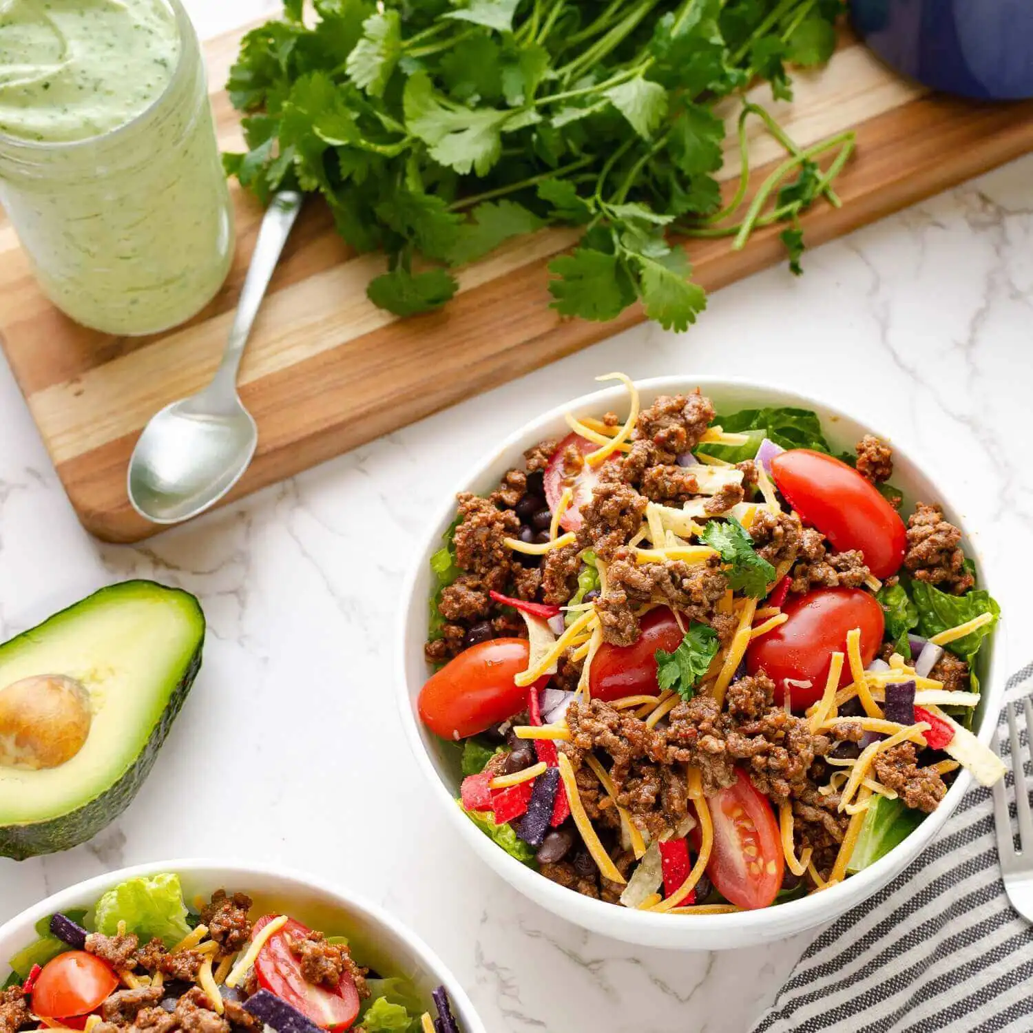 Ready in only 30 minutes, this taco salad with avocado Greek yogurt dressing is an easy and satisfying meal for any night of the week – but definitely before the big game. It’s loaded with wholesome ingredients like crunchy veggies, Greek yogurt and black beans, plus it’s bursting with fresh flavors thanks to the cilantro, salsa and avocado. If you want to go the extra yard, make a batch of our air fryer roasted tomato salsa to use in this taco salad recipe.